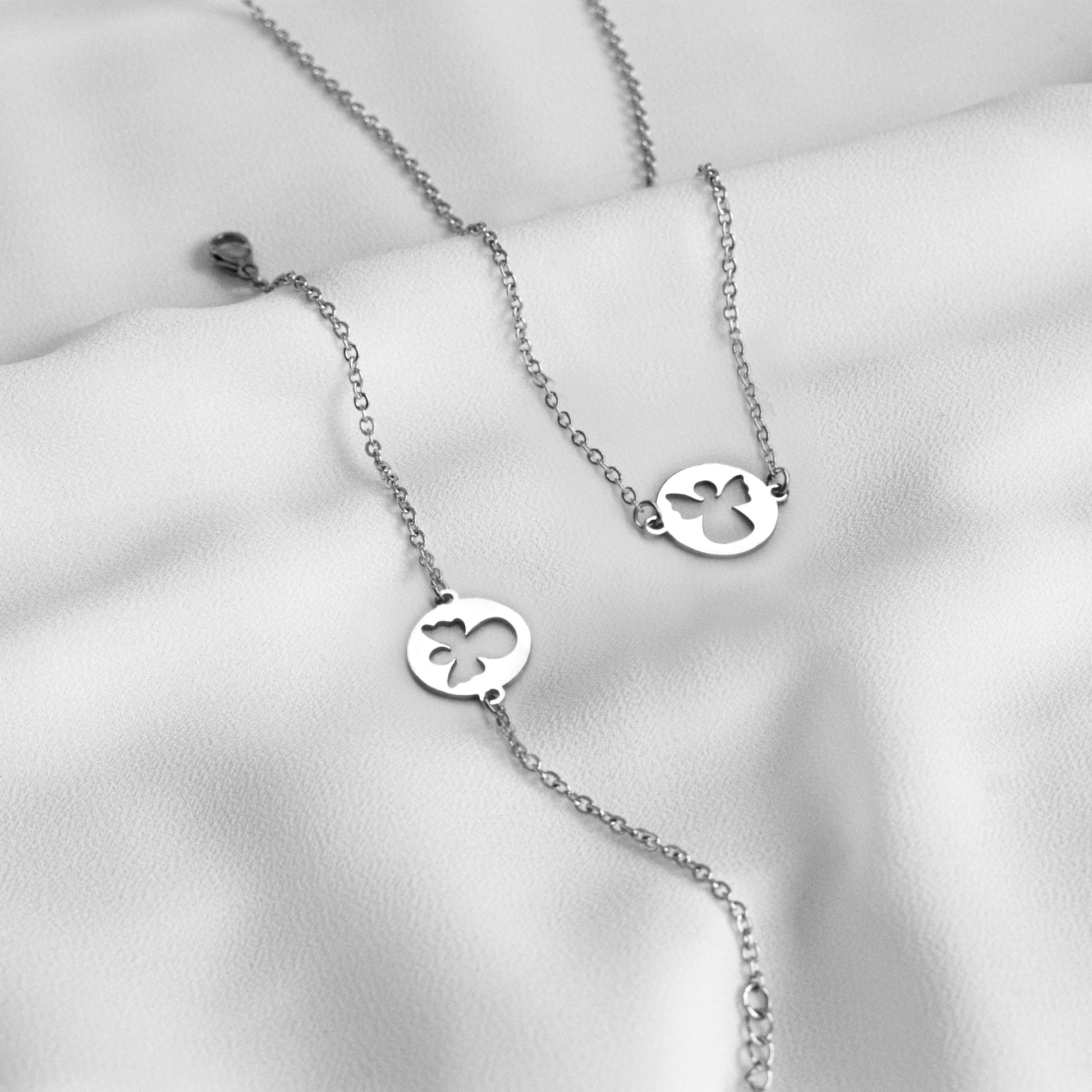 Ovaj komplet od nehrđajućeg čelika je poput elegantnog podsjetnika na zaštitu i ljubav koja nas okružuje. Krug obuhvaća nježno iscrtanog anđela, stvarajući skladan spoj ljepote i duhovnosti.