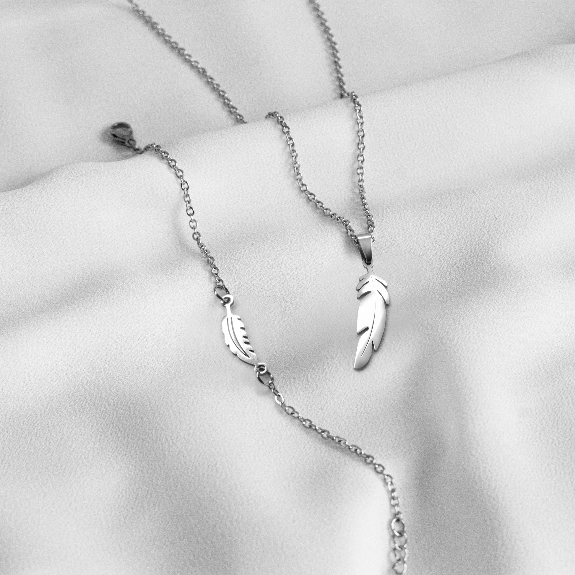 Ovaj prefinjeni komplet nakita od nehrđajućeg čelika sastoji se od ogrlice i narukvice, oba ukrašena delikatnim perjem. Pero simbolizira lakoću, slobodu i inspiraciju, dodajući posebnu notu ovom elegantnom nakitu. Ogrlica se nježno spušta oko vrata, ističući graciozno pero kao izvor inspiracije i slobode, dok se narukvica elegantno obavija oko zapešća, dodajući notu elegancije i suptilne ljepote svakom izgledu. Ovaj set nakita dolazi u prekrasnoj poklon kutiji, čineći ga savršenim darom za one koji cijene simboliku pera i posebne trenutke u životu.