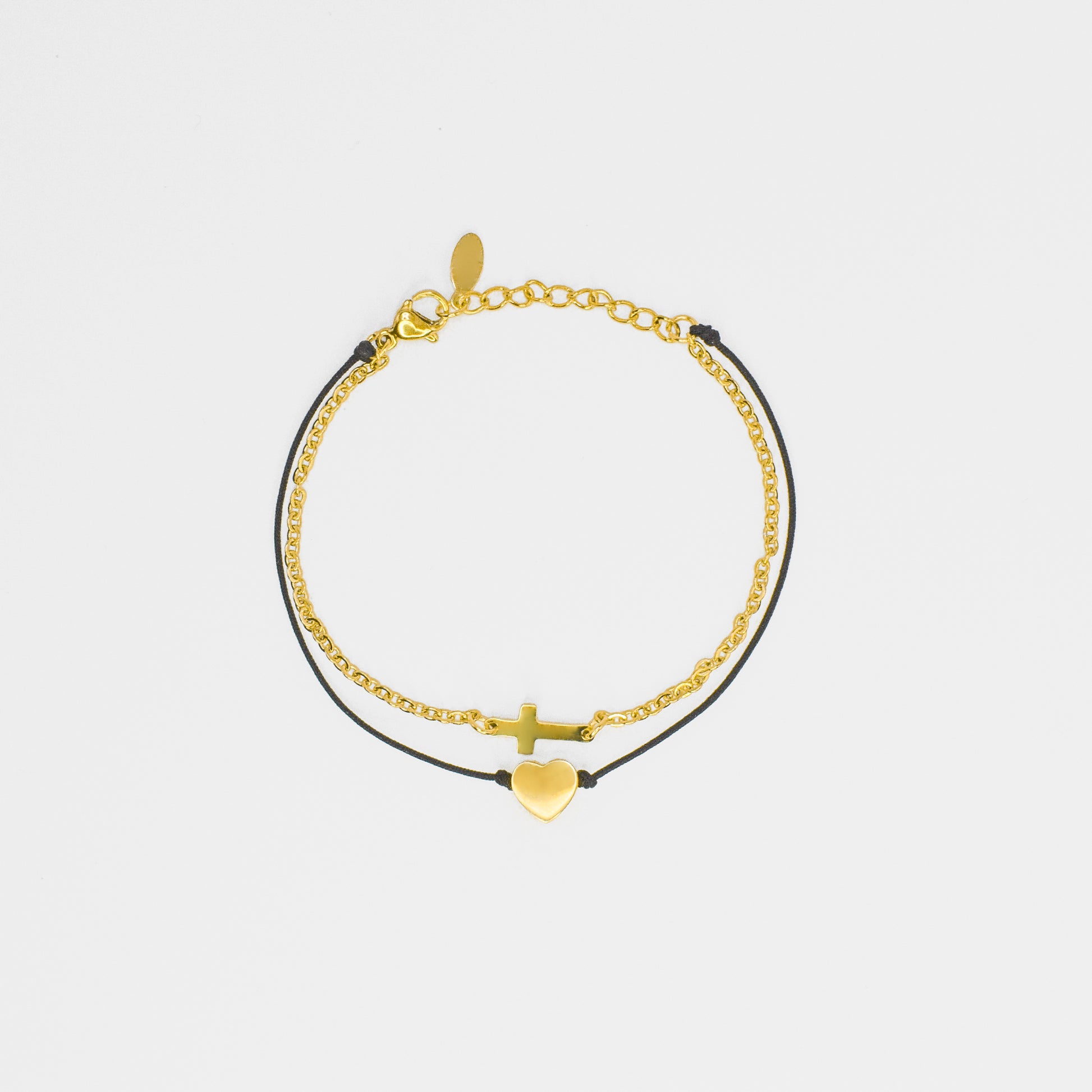 Amor Fe je jedinstvena zlatna narukvica koja spaja eleganciju tankog zlatnog lanca s jednostavnošću crne špage. U središtu ove narukvice nalaze se dva značajna privjeska: nježni zlatni križić i malo zlatno srce, simbolizirajući vjeru i ljubav.