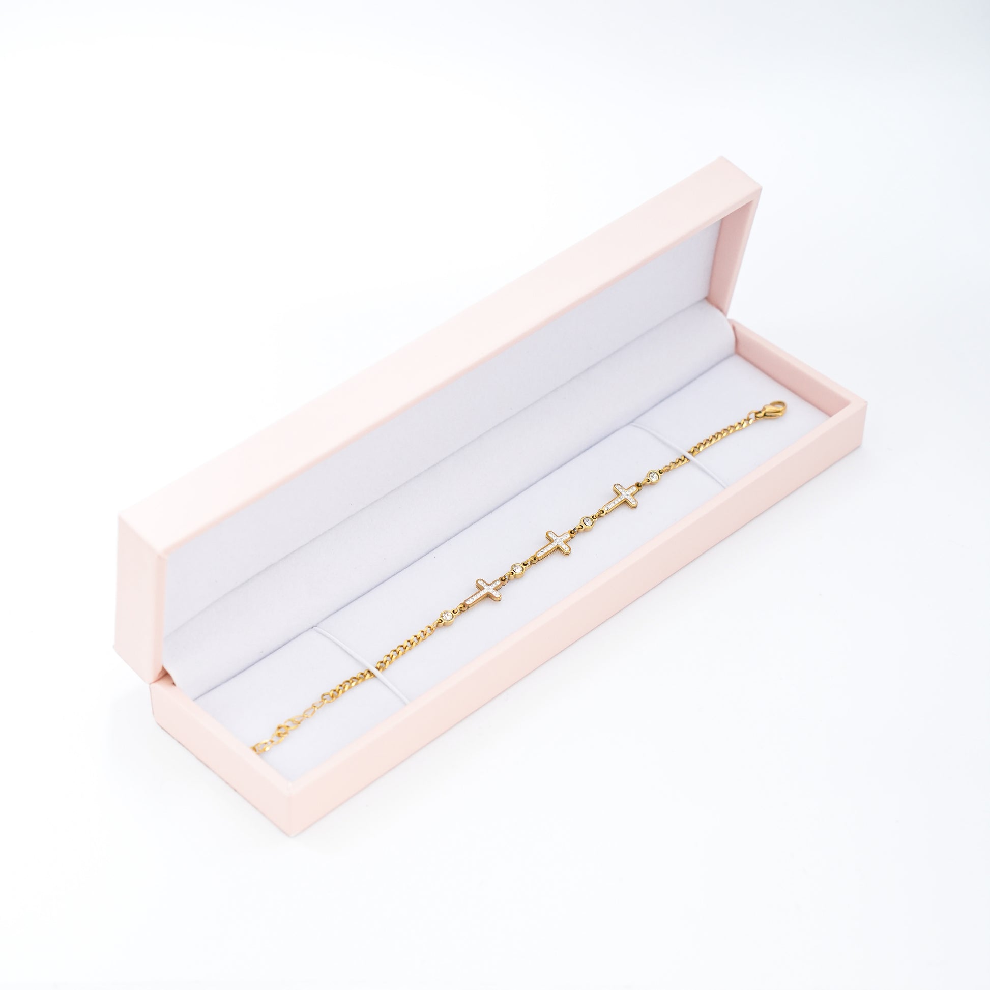 Divine Sparkle je nježna narukvica koja simbolizira vjeru. Tanka zlatna narukvica ukrašena je s tri mala, blistava križića raspoređena duž lanca. Svaki križić zrači suptilnim sjajem zahvaljujući pažljivo ugrađenim kamenčićima, a između njih decentno svjetlucaju mali dijamantići koji dodaju notu luksuza.