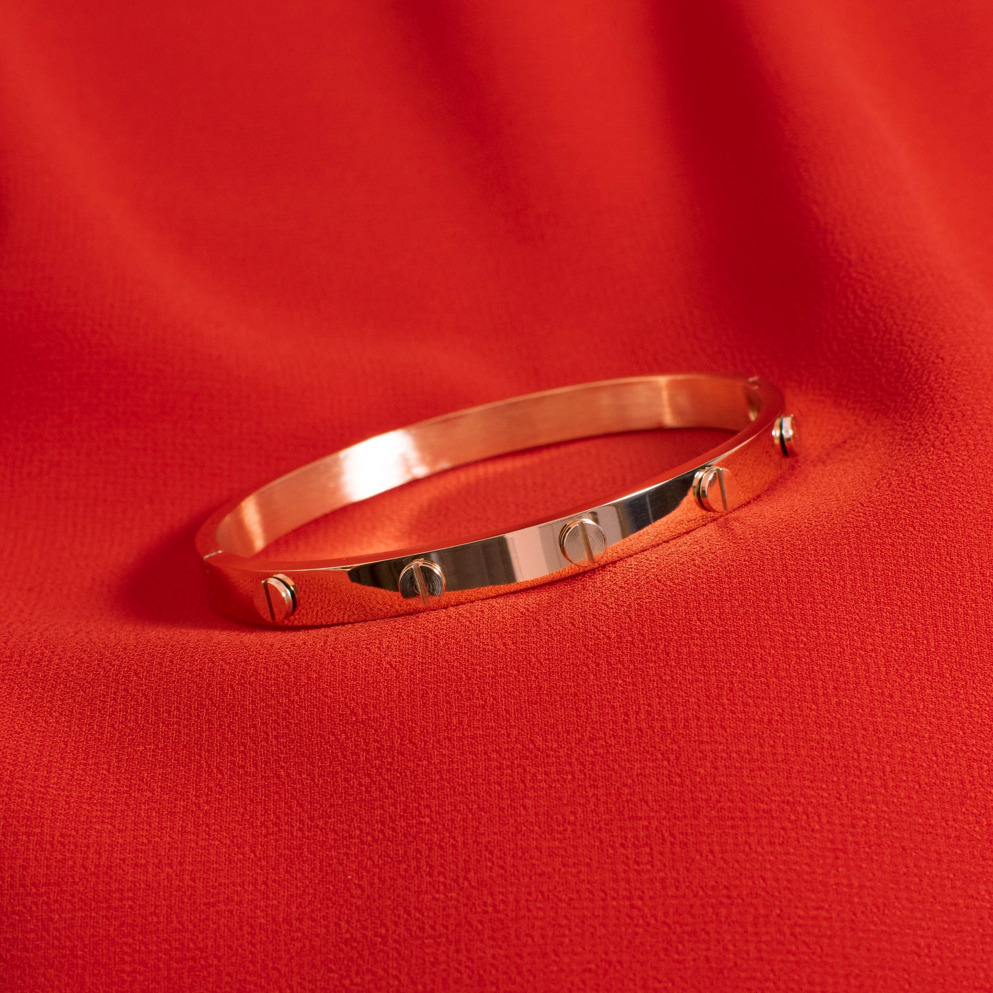 Sjajna narukvica Pattern od nehrđajućeg čelika u boji rozog zlata (rose gold). Cijelu narukvicu krase zanimljivi uzorci nalik vijcima. Elegantna je i izvrsna za sve prigode.