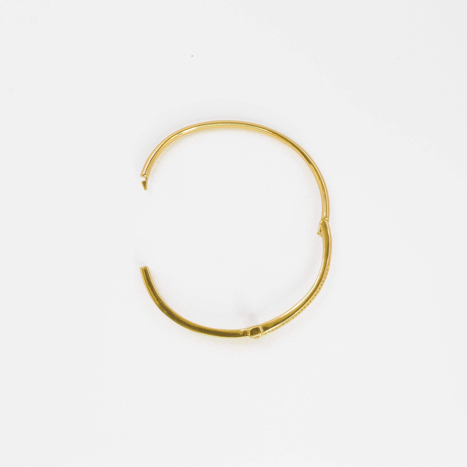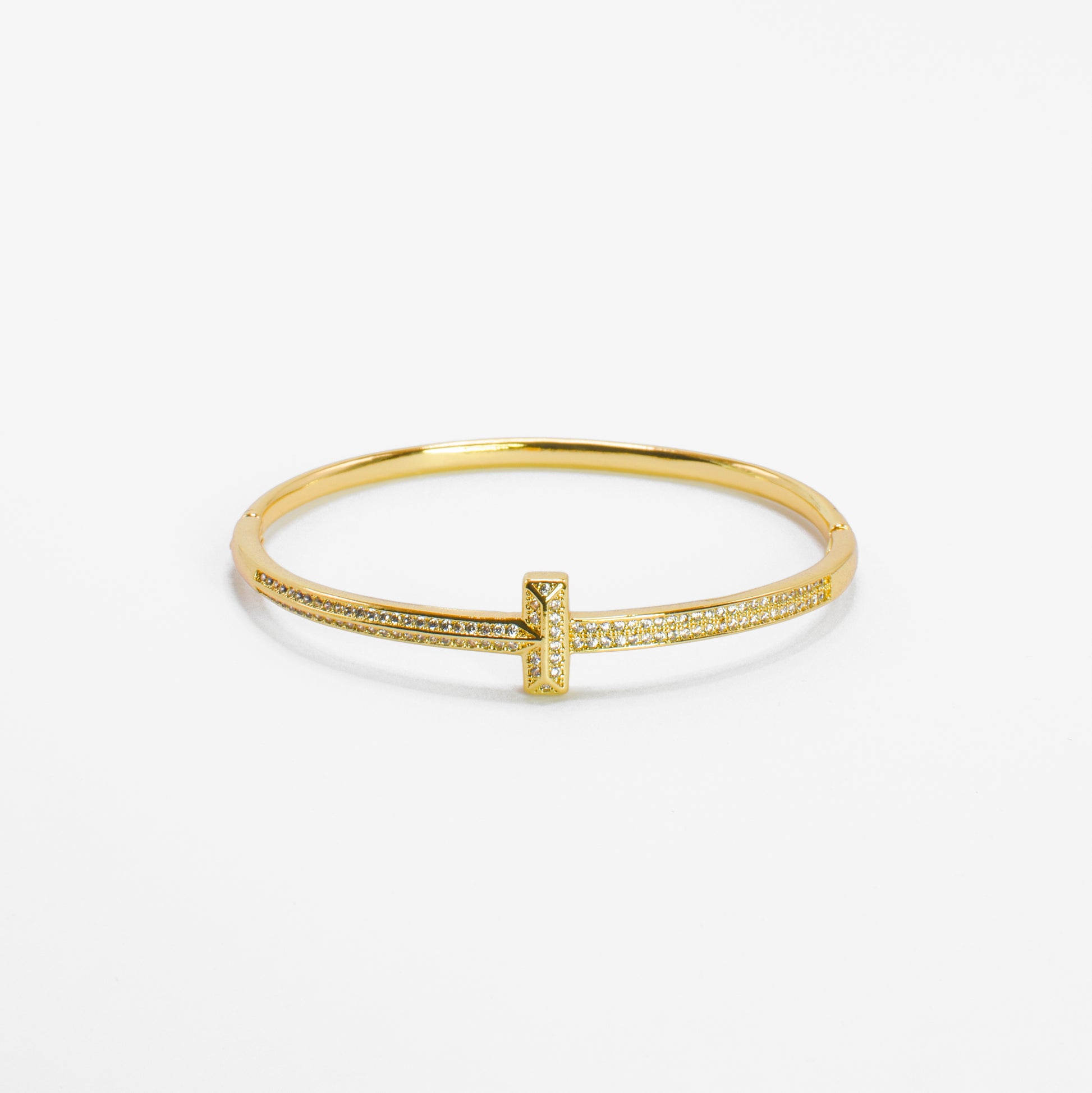 Tesor T je sofisticirana, tanka zlatna narukvica koja se ističe elegantnim "T" motivom u središtu. Horizontalni i vertikalni krak ovog prepoznatljivog oblika blistaju zahvaljujući pažljivo ugrađenim sitnim kamenčićima. Dodatni nizovi svjetlucavih kamenčića krase i dio obruča s obje strane središnjeg motiva, stvarajući kontinuirani sjaj.